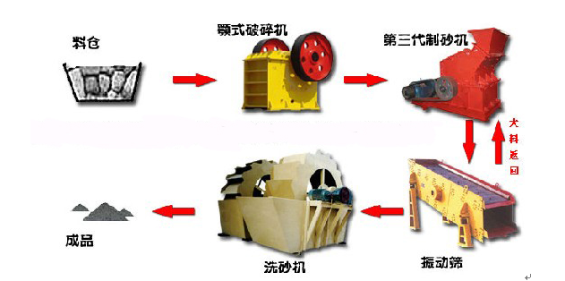機制砂石設(shè)備基本流程:先石料由粗碎機進行初步破碎,然后,產(chǎn)成的粗料由膠帶輸送機輸送至細碎機進行進一步破碎,細碎后的石料進振動篩篩分出兩種石子,滿足制砂機進料粒度的石子進制砂機制砂,另一部分返料進細破。進制砂機的石子一部分制成砂,經(jīng)洗砂機(可選)清洗后制成成品砂,另一部分進制砂機再次破碎。